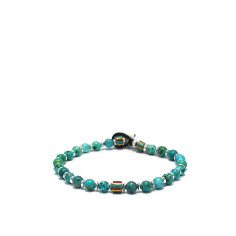 MIKIA 5mm Stone Bracelet – Turquoise: A bracelet with alternating sky blue turquoise and silver Karen beads. Exquisitely colored trade beads add spice. Crafted in Japan and using Mikia original clasps with engravings.
