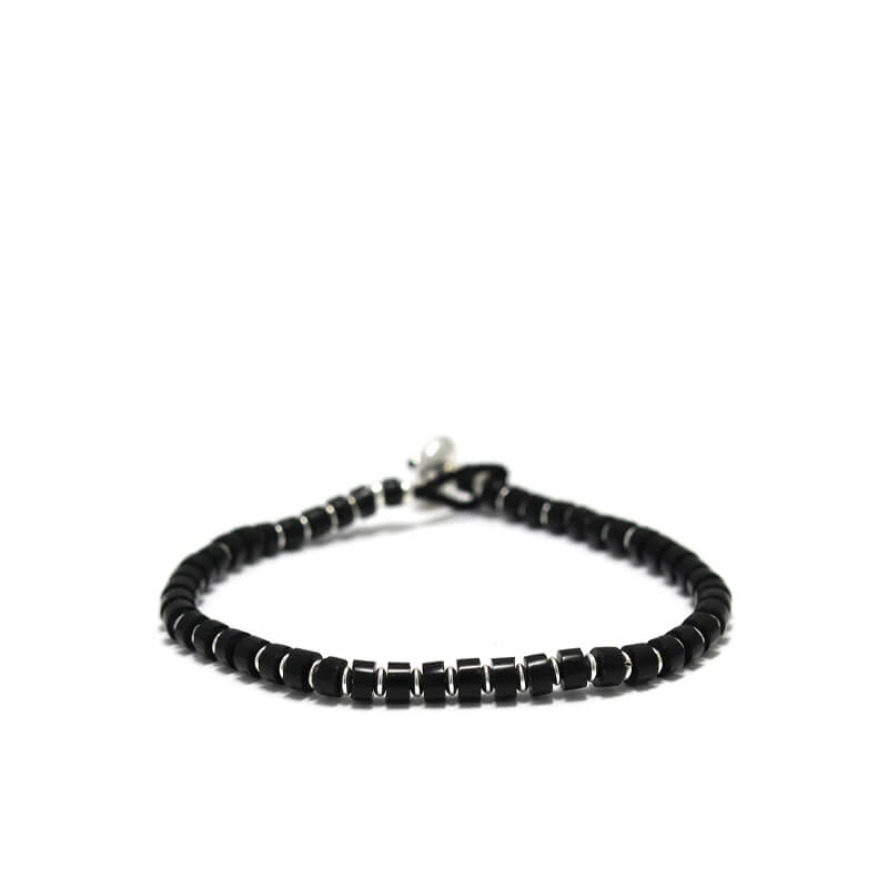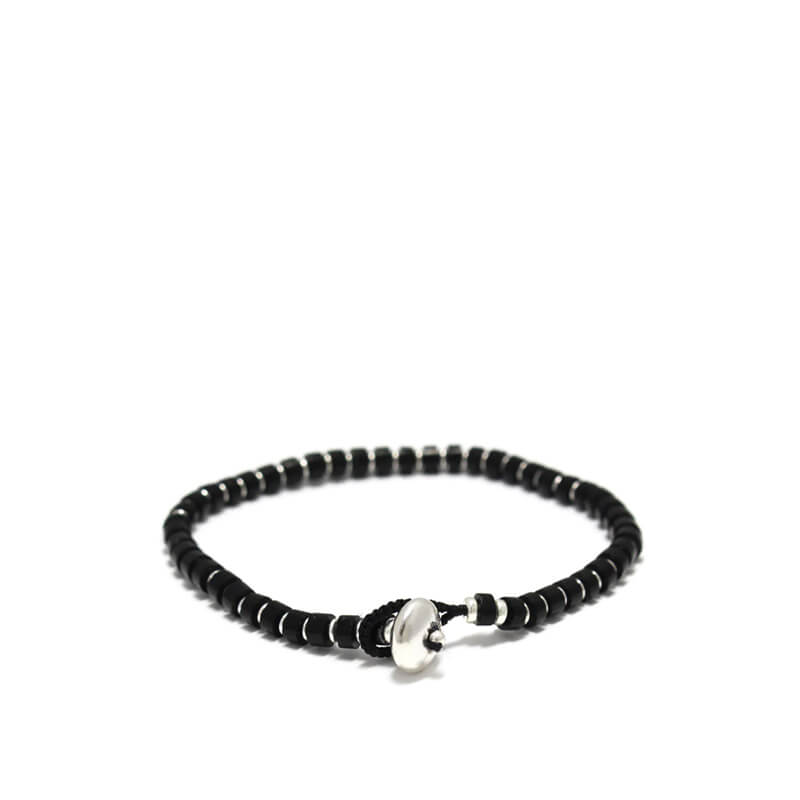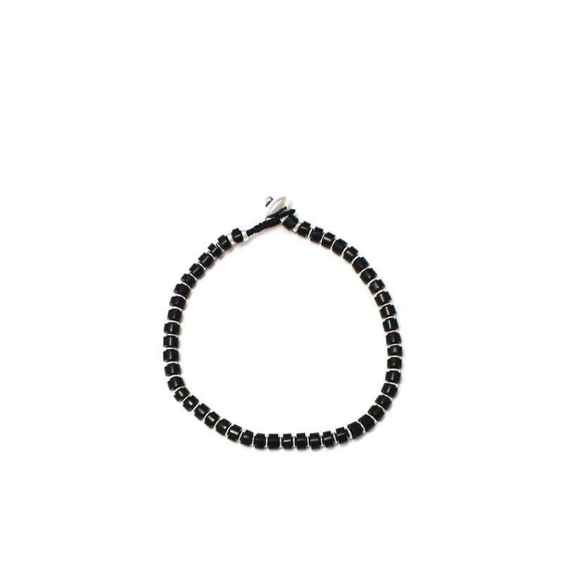MIKIA Heishi Jet Bracelet – Silver: Jet is a fossilized tree that has been compressed and carbonized over many years on the ocean floor. This bracelet is accented with tube-shaped jets and alternating Karen silver beads. Crafted in Japan and using Mikia original clasps with engravings.