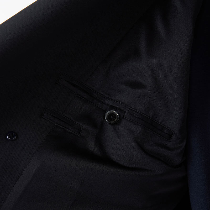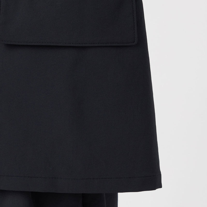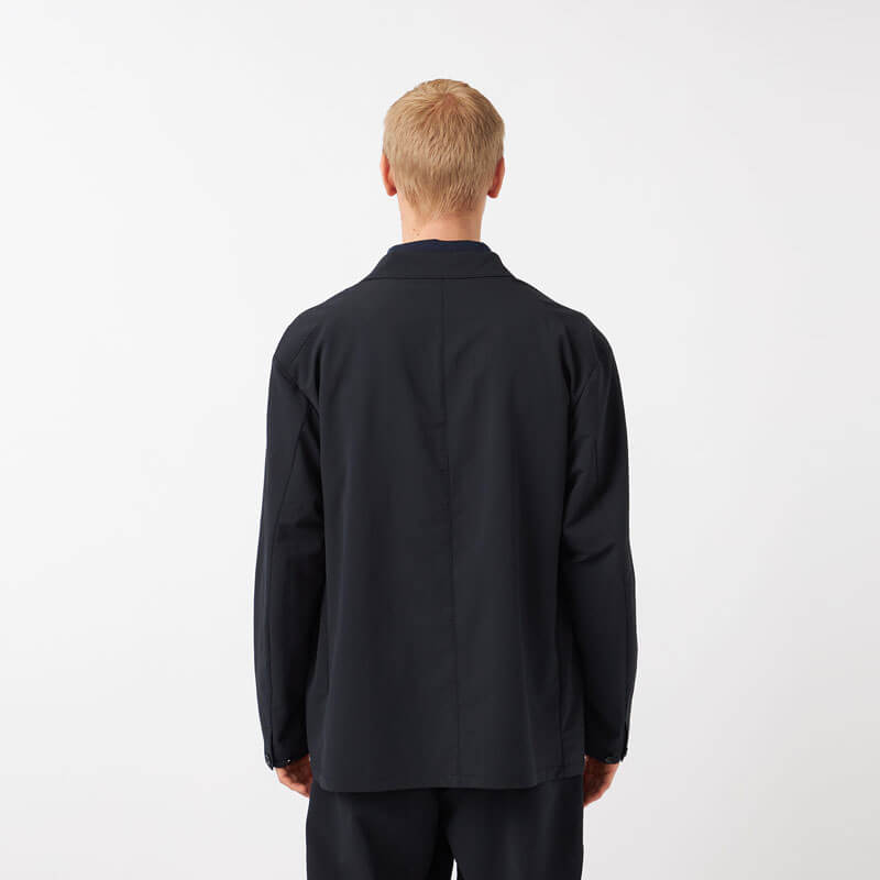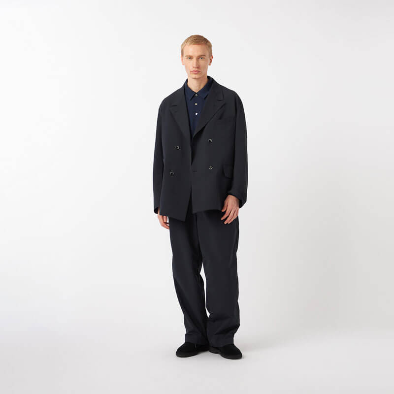 NANAMICA ALPHADRY Club Jacket – Black: Four-button double-breasted jacket made with ALPHADRY®, featuring excellent moisture-wicking, quick-drying, and stretch properties.