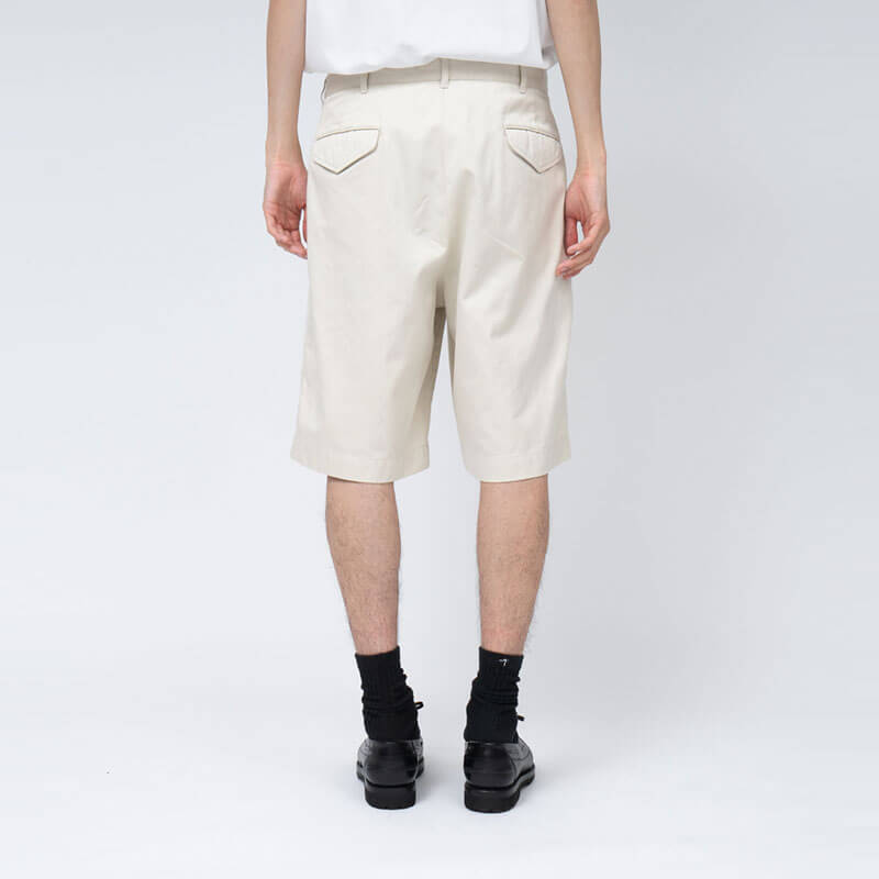 NANAMICA Double Pleat Chino Shorts – Navy: Wide tapered cut 2-tuck shorts pant crafted in classic chino material made from a 2-layer covering core yarn with recycled polyester wrapped in organic cotton. This nanamica original hybrid fabric combines the soft feel of cotton with lightweight, durable, and quick-drying functionality. Design based on 1960s U.S. Air Force officer trousers, this pant features front zipper opening and back pocket with concealed button.