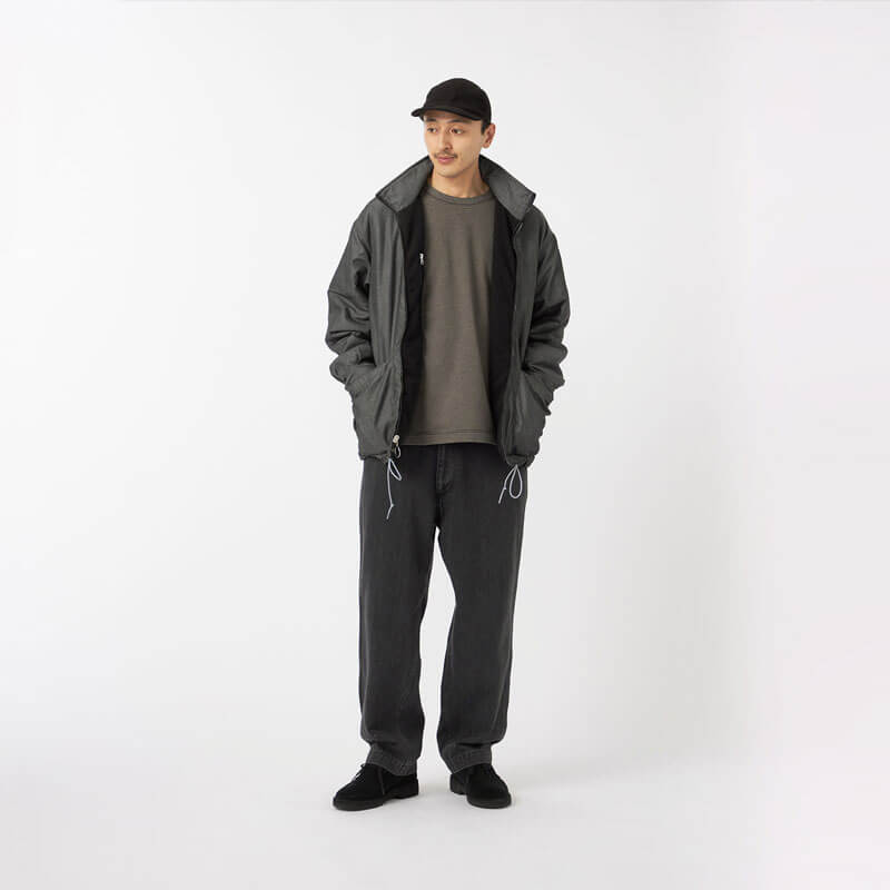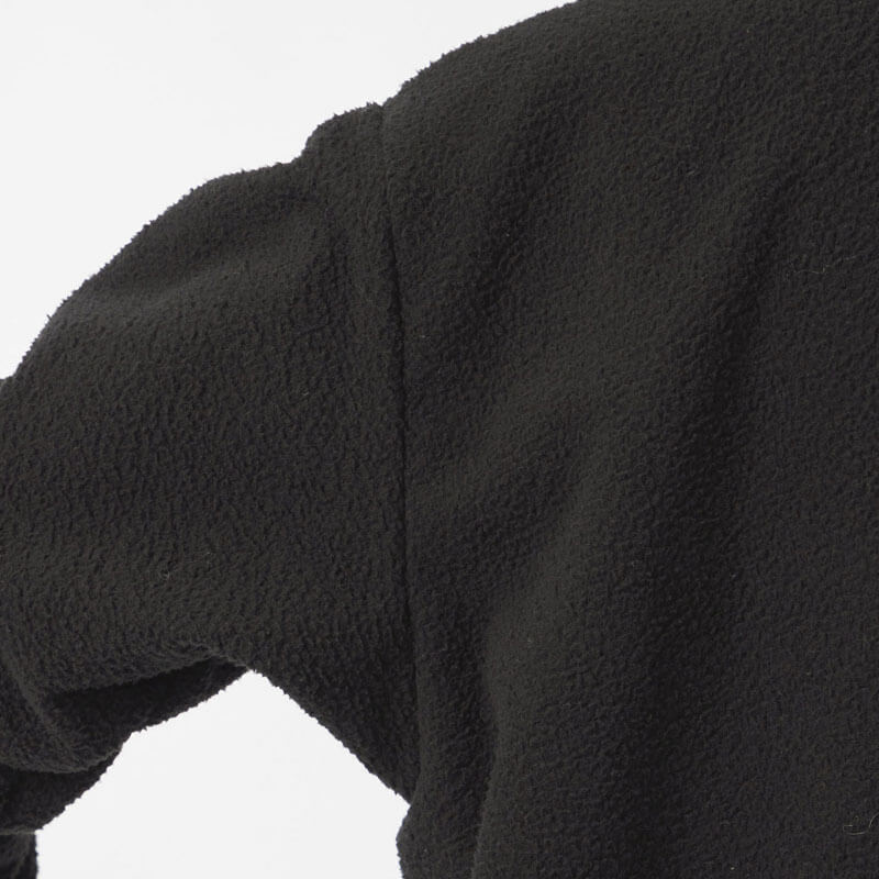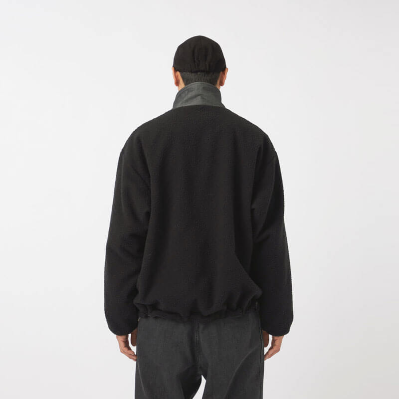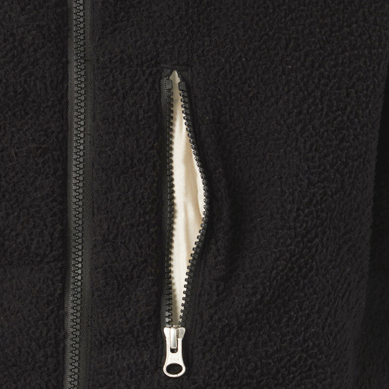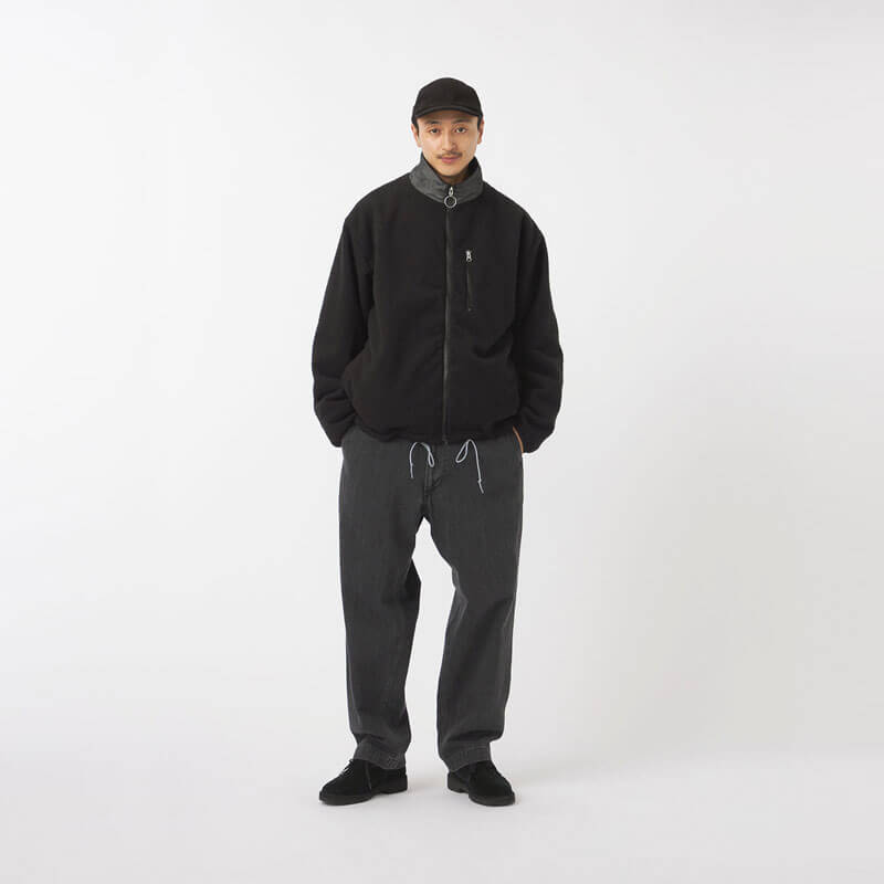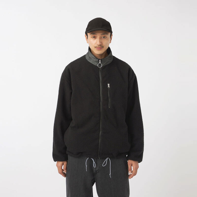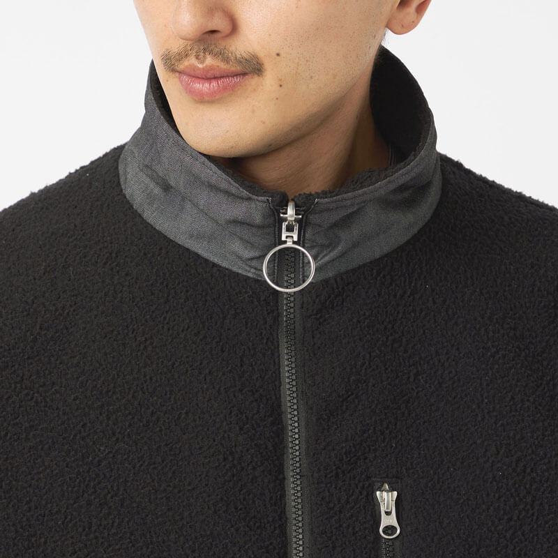 NANAMICA Reversible Dock Jacket – Black: Reversible zip-up jacket. The outer side uses recycled polyester boa fleece with non-fluorinated water-repellent treatment while the inner side features recycled polyester twill with a denim-like appearance.