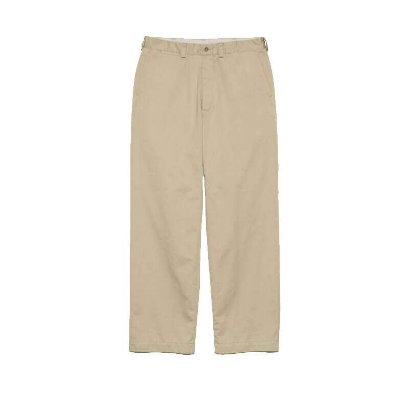 NANAMICA Wide Straight Chino Pant – Khaki: Wide straight cut chino pants based on 1950s U.S. Army chino trousers. Crafted in classic chino material made from a 2-layer covering core yarn with recycled polyester wrapped in organic cotton. This nanamica original hybrid fabric combines the soft feel of cotton with lightweight, durable, and quick-drying functionality.