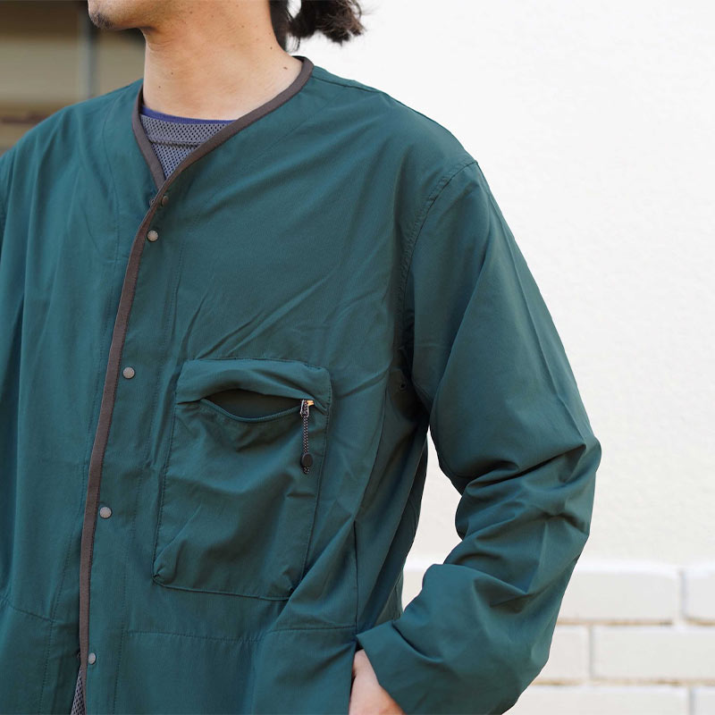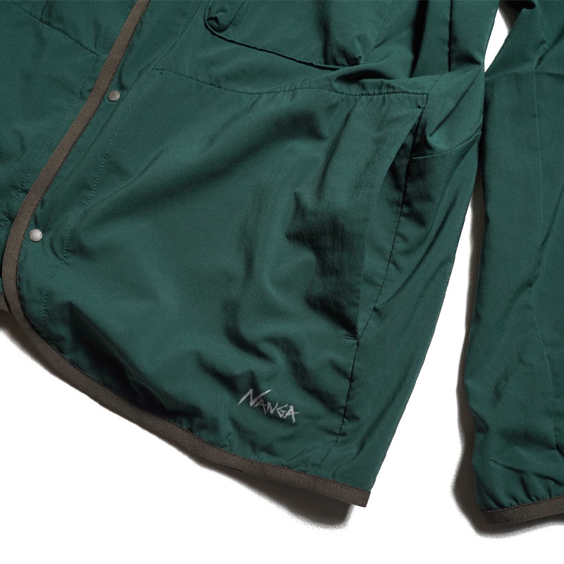 NANGA PLC Excursion Cardigan – Green: This spring and summer, NANGA is introducing a new no-collar cardigan from their PLC series. The lightweight and compact PLC EXCURSION CARDIGAN is perfect for travel, business trips, and everyday use.