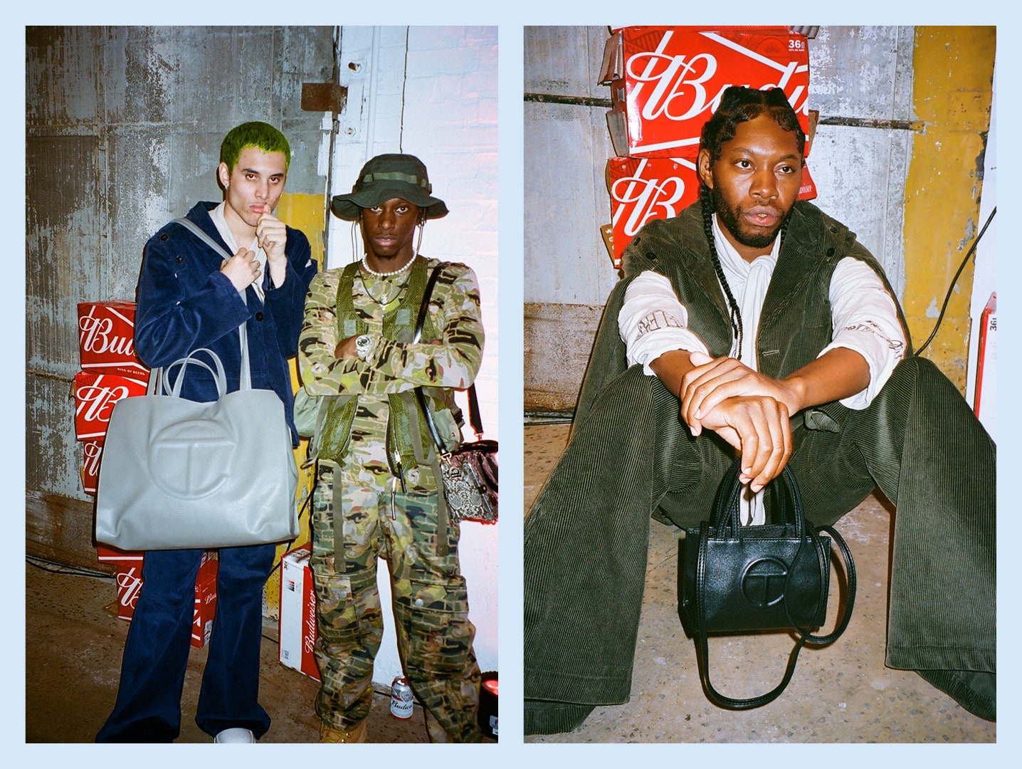 Las bolsas de compras Telfar han existido desde 2014, pero en los últimos años han tenido un gran éxito en la red, convirtiéndolas en un artículo básico que hay que tener. Hechos de cuero 100% vegetariano, los bolsos de compras tienen el logo TC en relieve de Telfar y vienen en tres tamaños diferentes y muchos colores diferentes: negro, bronceado, blanco, oliva oscuro, sangre de buey, azul marino, amarillo, crema, gris, rosa chicle entre otros.