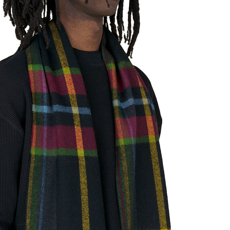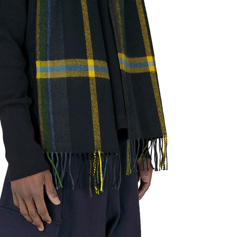 NICHOLAS DALEY Tartan Scarf – Night Tartan Black: Tartan scarf made in Scotland from seasonal Nicholas Daley registered tartan. Features hand-finished blanket fringing, celebrating the brand’s dedication to traditional craftsmanship and artisanal heritage.