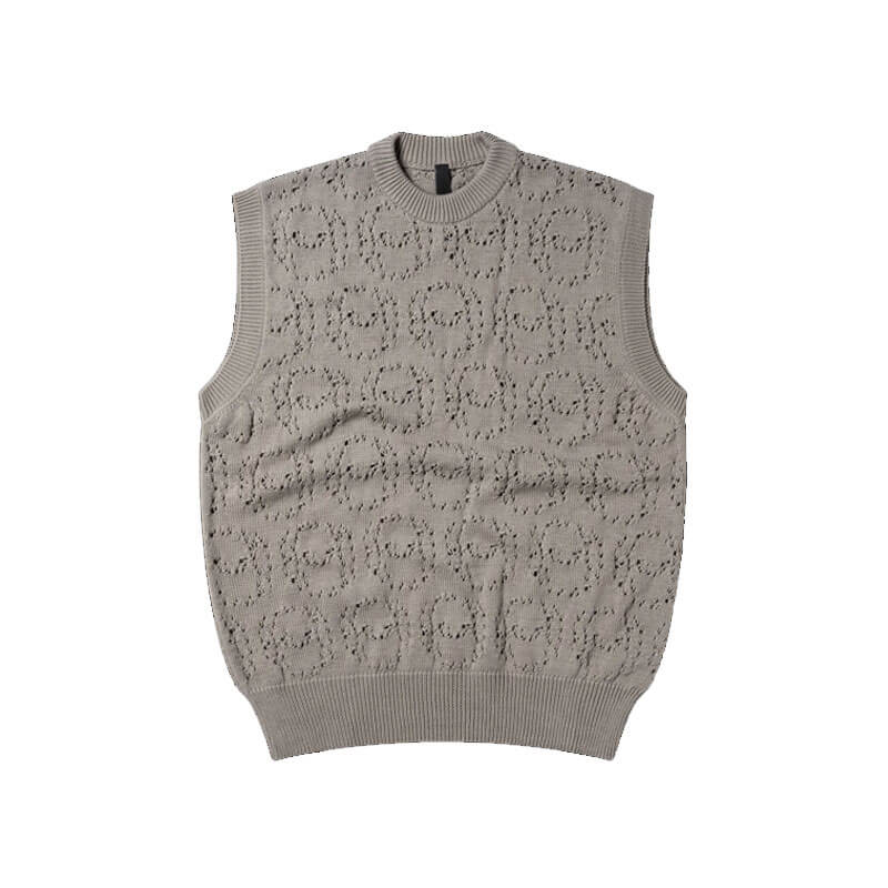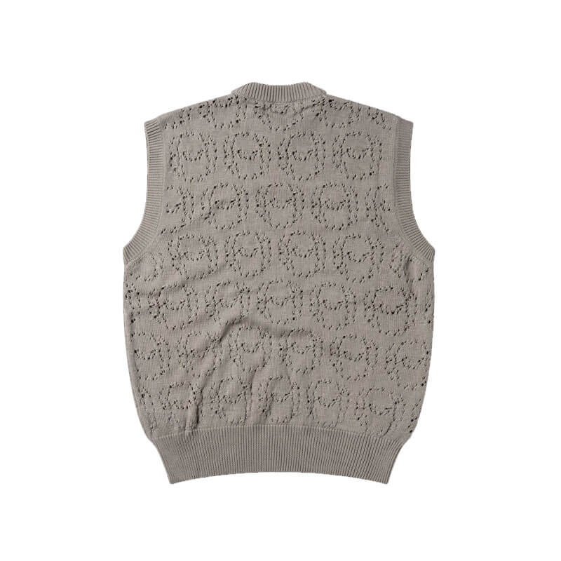 NO PROBLEMO Alien-O Lace Vest – Grey: Unisex knitted vest made from a mohair-blend yarn. Featuring an allover perforated Alien-o lace design.