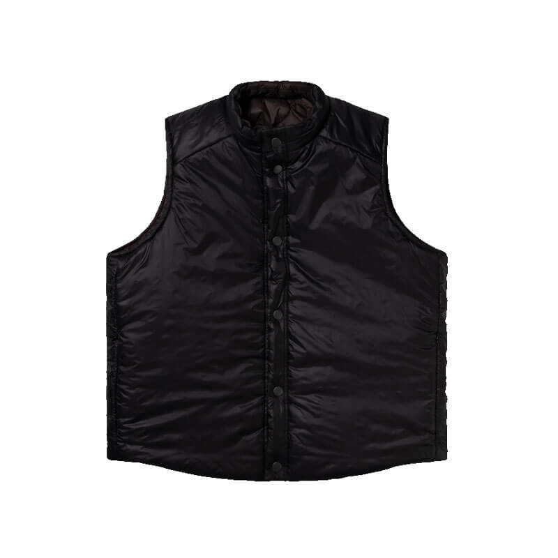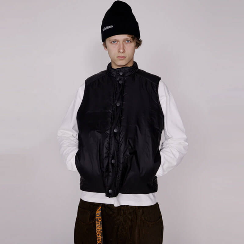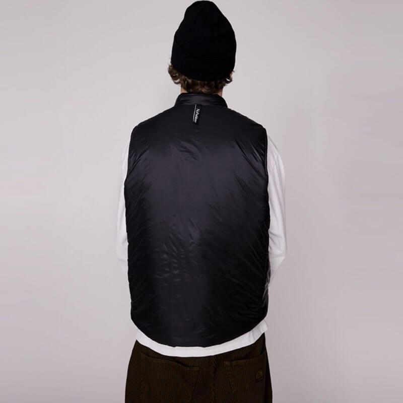 NO PROBLEMO Alien O-Liner Vest – Brown: Unisex liner vest with padded Alien-O stitch detailing, fully reversible with brown on one side and black on the reverse. Featuring elasticated kangaroo pocket on outer and hidden pockets on reverse, plus reflective silicone ‘No Problemo’ patch.