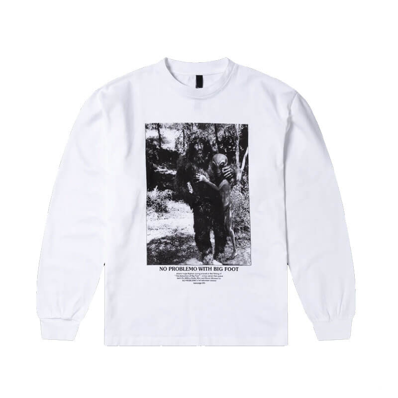 NO PROBLEMO Big Foot LS Tee – White: Made from 100% cotton, this heavy-weight No Problemo longsleeve t-shirt is designed with a rib knit collar and cuffs and a straight cut hem. Finished with a ‘Big Foot’ printed graphic design on front chest.