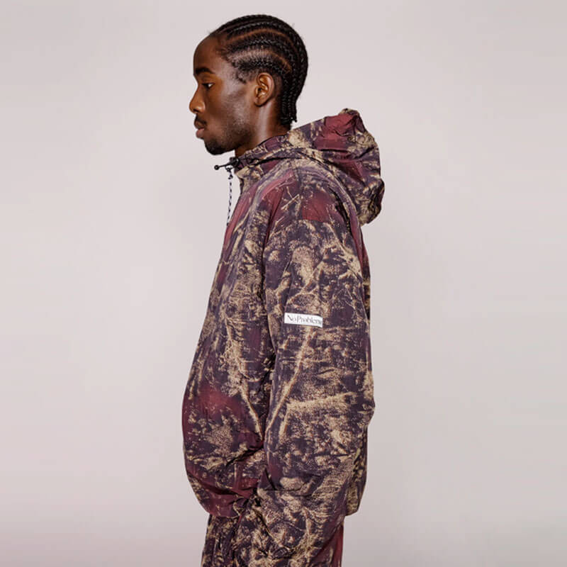 NO PROBLEMO Forest Glitch Nylon Jacket – Camo: Unisex lightweight zip through hooded nylon track-jacket. With mesh lining, adjustable elastic cord hem and hood and back zip pocket. Featuring a ‘No Problemo’ tree camo allover print and a reflective silicone brand patch.