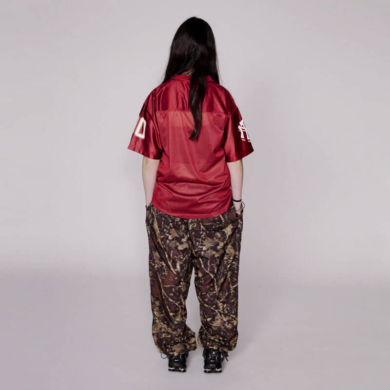 NO PROBLEMO Np00 Sport Poly Jersey – Red: Airtex sport jersey in polyester and mesh mix with ‘Zero Problemo’ graphic print on the front and sleeve, featuring branded label on front.