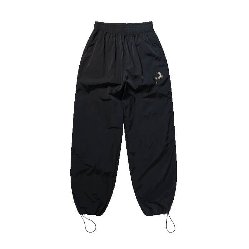 NO PROBLEMO Nylon Windcheater Track Pants – Black: Unisex lightweight trackpant constructed in a black nylon fabric. Including an elasticated waistband, ankle toggles and zip patch pocket on the back. This pant is finished with a glossy tonal Alien-o graphic on the front.