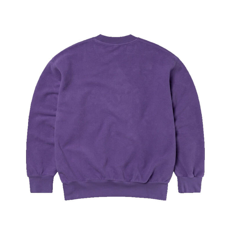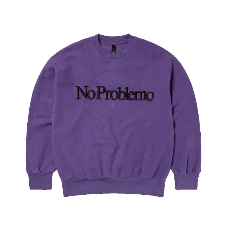 NO PROBLEMO Reverse Fleece Sweat – Lilac: Unisex sweatshirt crafted from brushed-back 100% cotton jersey fleece, featuring ‘No Problemo’ embroidery on front.
