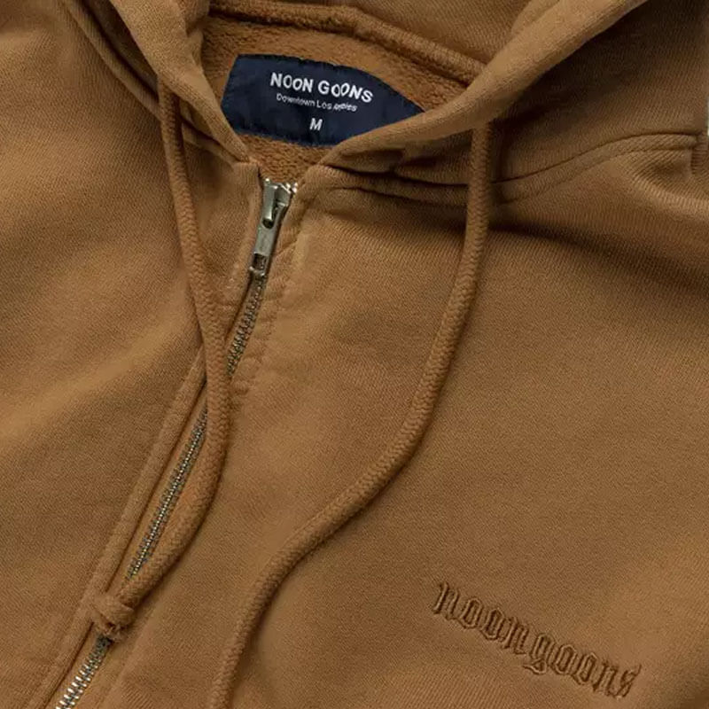 NOON GOONS High Tide Zip Hoodie – Brown: Garment-dyed heavyweight cotton fleece hoodie. Featuring a relaxed fit and a full zipped closure, this NOON GOONS High Tide Zip Hoodie – Brown is part of the last FW23 collection and equipped with: