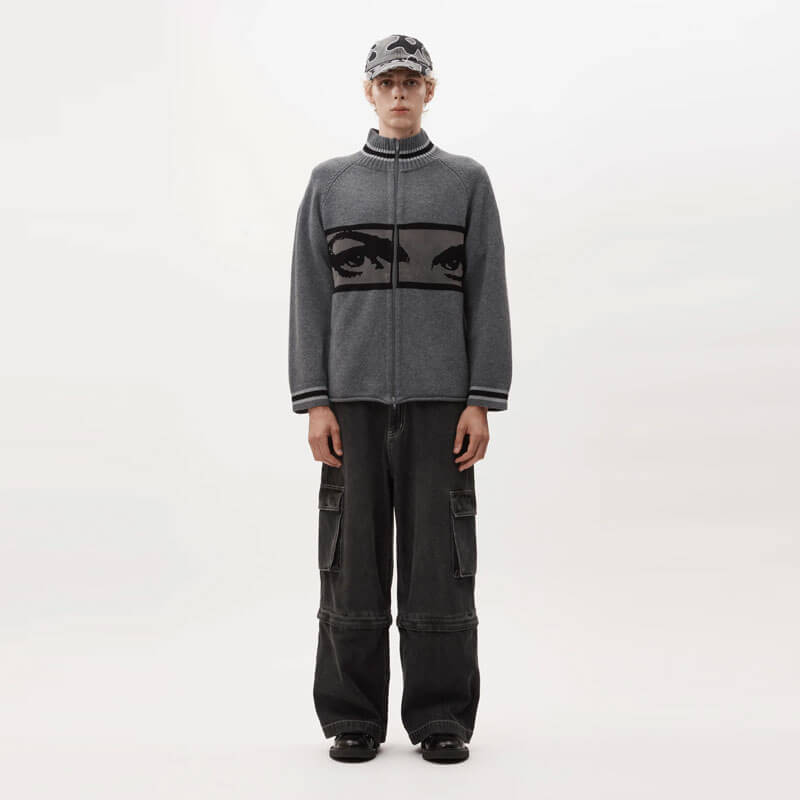 P.A.M. (Perks & Mini) Eyes Zip Thru Knit Cardigan – Black / Grey: Full zippered knit cardigan with jacquard graphic design on front.