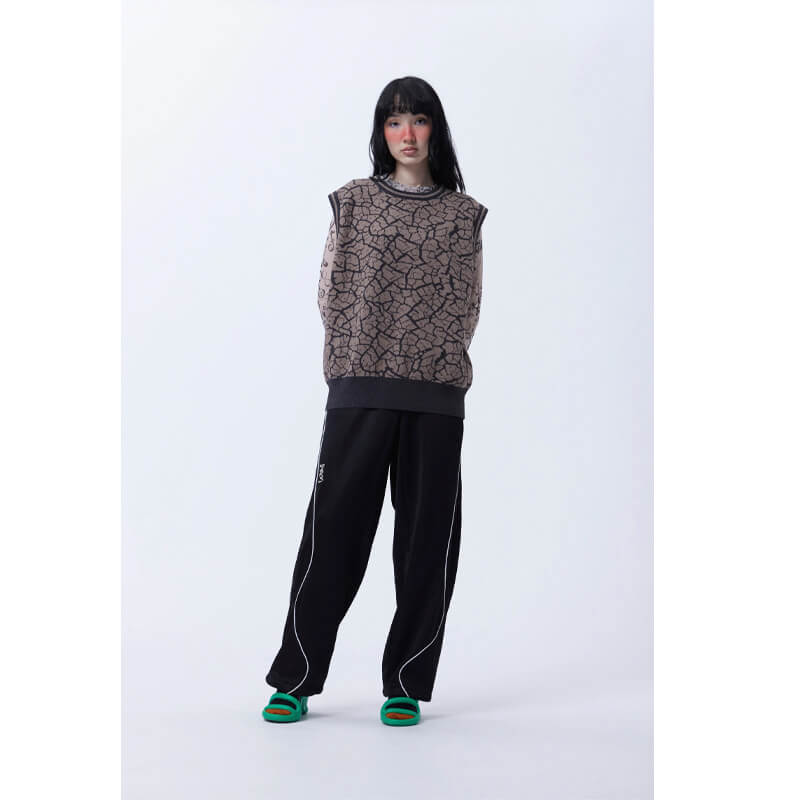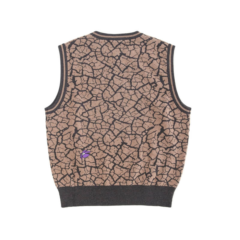 P.A.M. (Perks & Mini) Mudcrack Knitted Vest – Taupe: Organic Cotton and Cashmere blend, boxy fit vest with gentle gather at the hem. Vest features all over ‘Mudcrack’ jacquard knitted artwork and PAM Gestures embroidery at the back. This vest has 2×2 ribbing at armhole, neck and hem.
