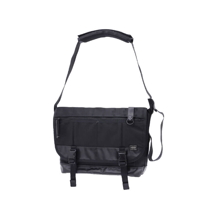 PORTER YOSHIDA & CO. Heat Messenger Bag (L) – Black: Shoulder bag with one strap crafted in ballistic nylon with leather details. A nylon band, D-shaped metal parts and a double ring are attached. You can use them as well as a carabiner and a wallet chain, to coordinate accessories such as wallets and pouches. Finished with thick nylon tapes to improve usability and durability. This PORTER YOSHIDA & CO. Heat Messenger Bag – Black features: