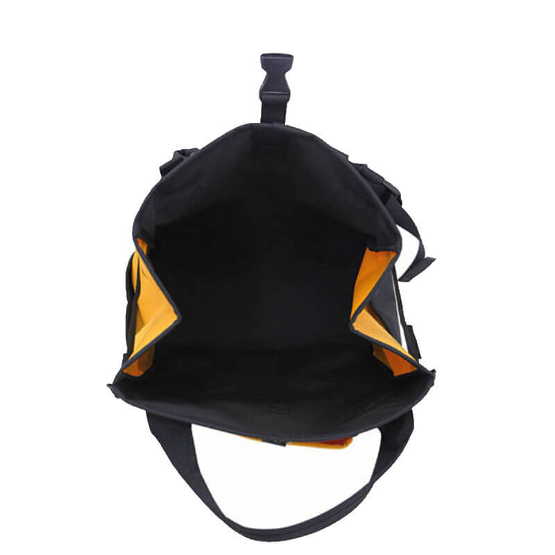 PORTER YOSHIDA & CO. Union Tote Rucksack – Yellow / Black: Rucksack backpack inspired by workwear with multiple pockets. The distinctive front pocket features rivets and a striking green-coloured name tag. Also it are equipped with two long handles for easy handle and are designed to be highly functional and withstand hard use. This PORTER YOSHIDA & CO. Union Tote Rucksack – Yellow / Black features: