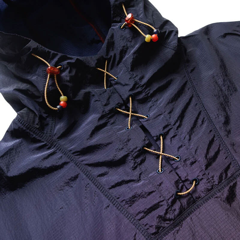 Hooded, water-repellent windcheater pullover jacket in an all over ombre effect print with criss cross lace detailing at the centre collar for fit adjustment. Featuring an Aries x Puma Temple logo print. Adjustable hood with bungee drawcords and decorative beads, elastic cuffs and adjustable elastic hem. With zip pockets at side and back and decorative cover stitch detail. Designed for a relaxed fit.