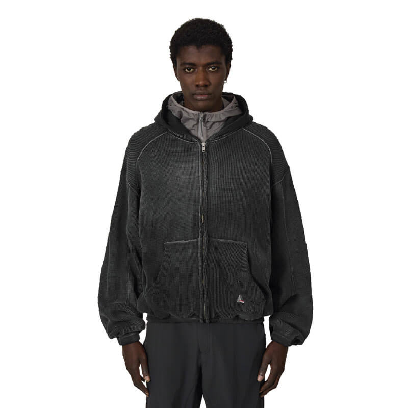 Included in the last Fall25 delivery, this ROA Hiking Bee Sun Faded Waffle Zip Up Hoodie – Black features: