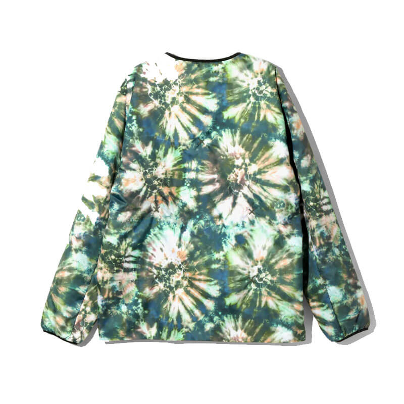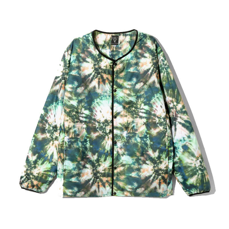 SOUTH2 WEST8 Filling Jacket – Green Tie Dye Poly Taffeta: A piece made with the motif of a liner jacket, which is lightweight and has excellent heat retention. The thin polyester taffeta is intentionally printed with a tie-dye pattern, giving it a unique texture. The volume of the filling is moderately suppressed, making it an item that can be styled as both light outerwear and innerwear.