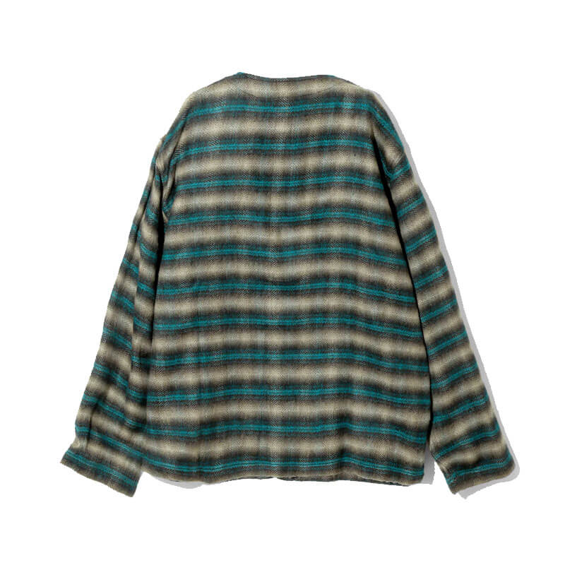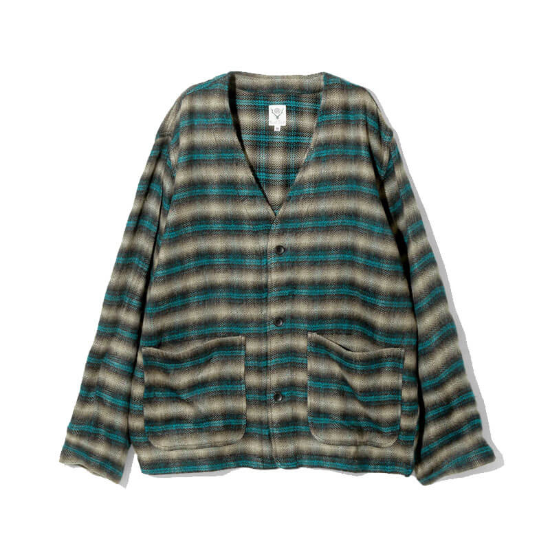 SOUTH2 WEST8 V Neck Jacket – Plaid Emerald / Black: The South2 West8 cardigan-type jacket features a deep V-neckline and two patch pockets on the front. This season, a checkered acrylic fabric with a brushed feel is used, and the moderately loose feel makes it more of a relaxing piece.