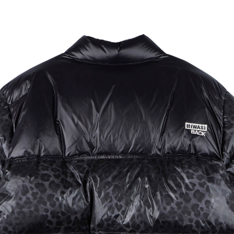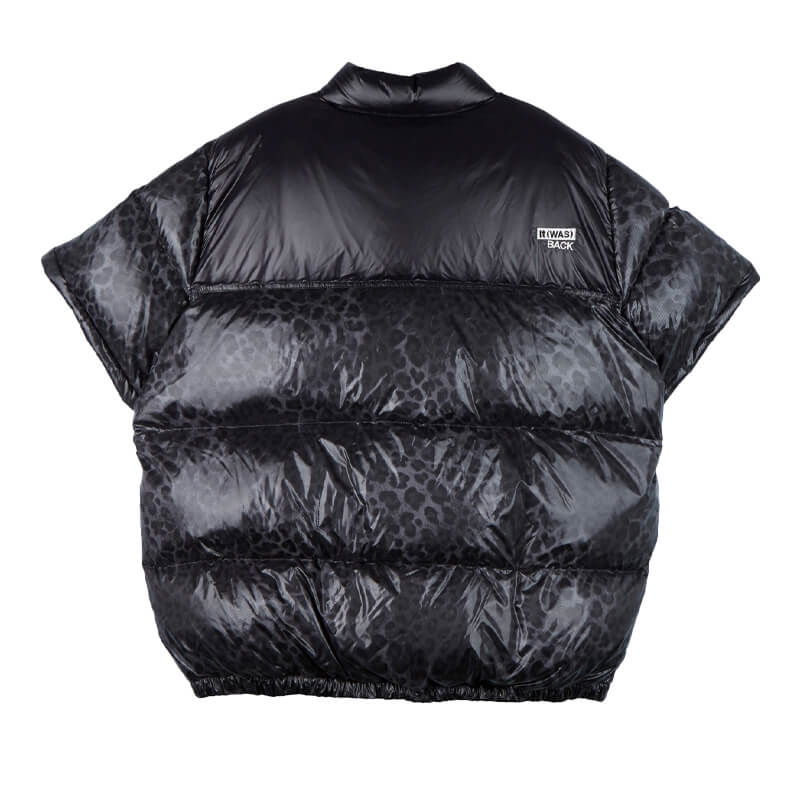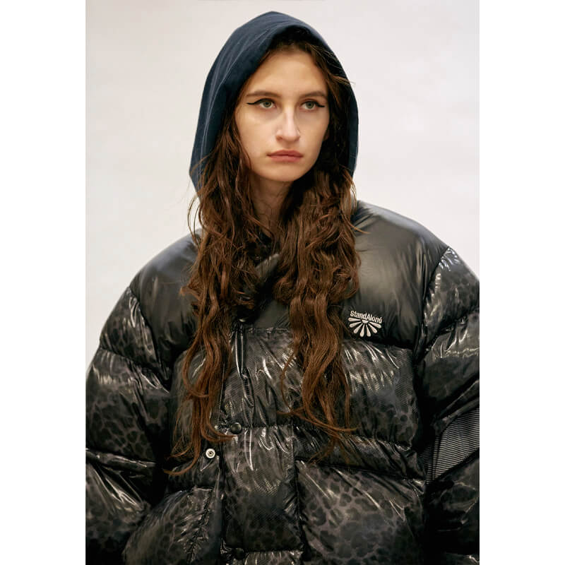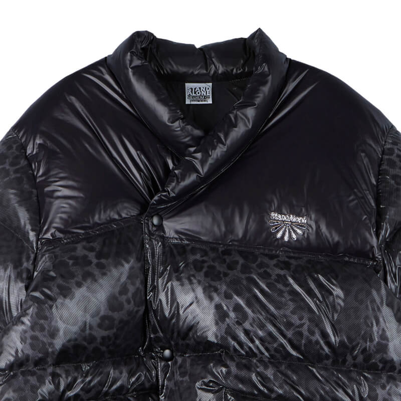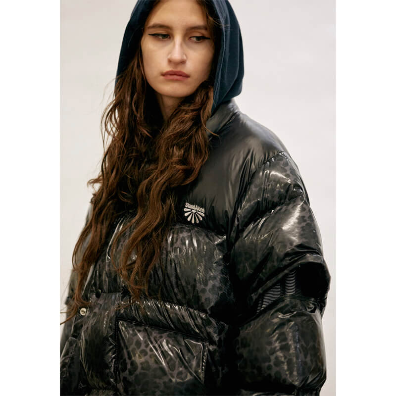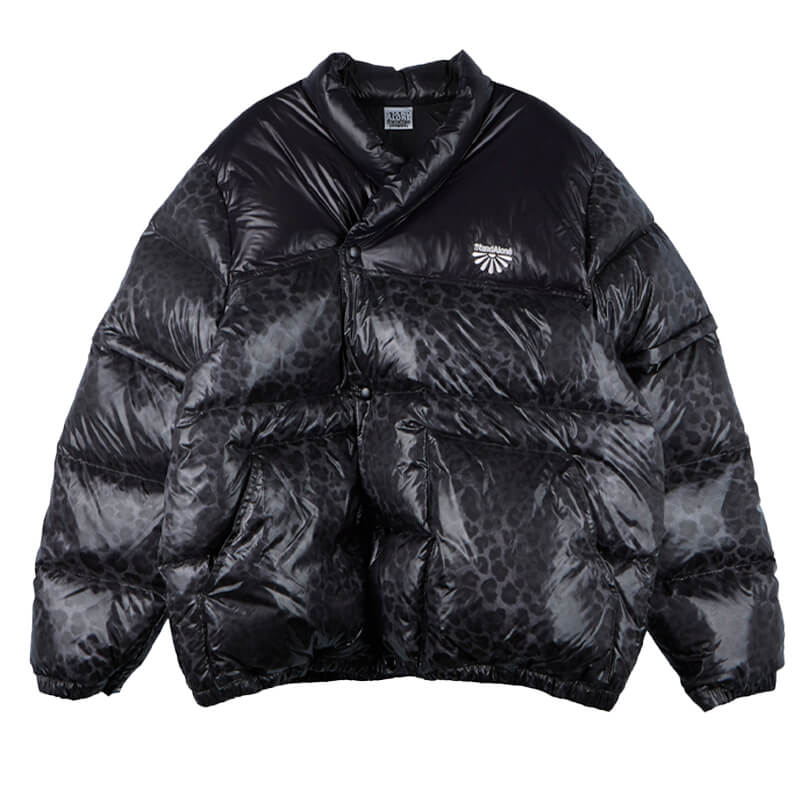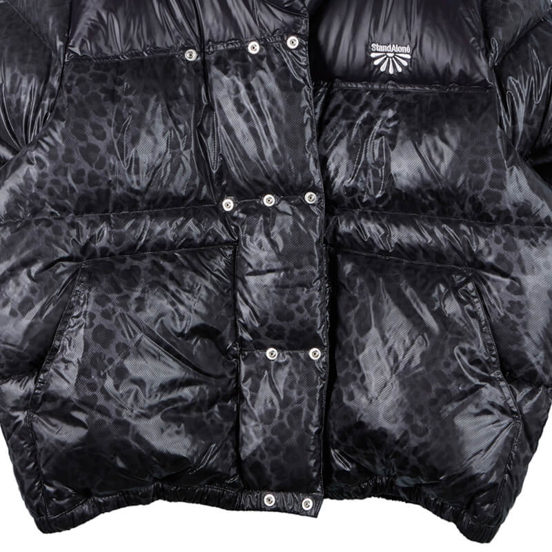 STAND ALONE Detachable Leopard Puffer – Black: Glossy leopard pattern nylon goose down jumper with detachable sleeves for two styling options. With a relaxed length and deep neckline, depending on the position of the fastening snaps, various silhouettes can be created. Featuring comfortable fit thanks to rubber banding at the bottom. Included in the last FW23 delivery, this STAND ALONE Detachable Leopard Puffer – Black features: