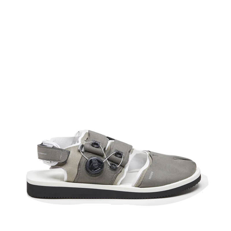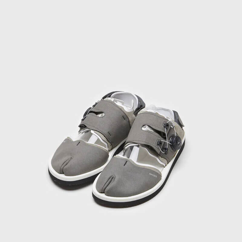 SUICOKE Haku-Ab Sandals – Gray x White: Split-toe sandals crafted in vegan leather.  They’re subtly debossed with brand logo and rest on a comfortable Eva antibacterial foam sole. This SUICOKE Haku-Ab Sandals – Gray x White features: