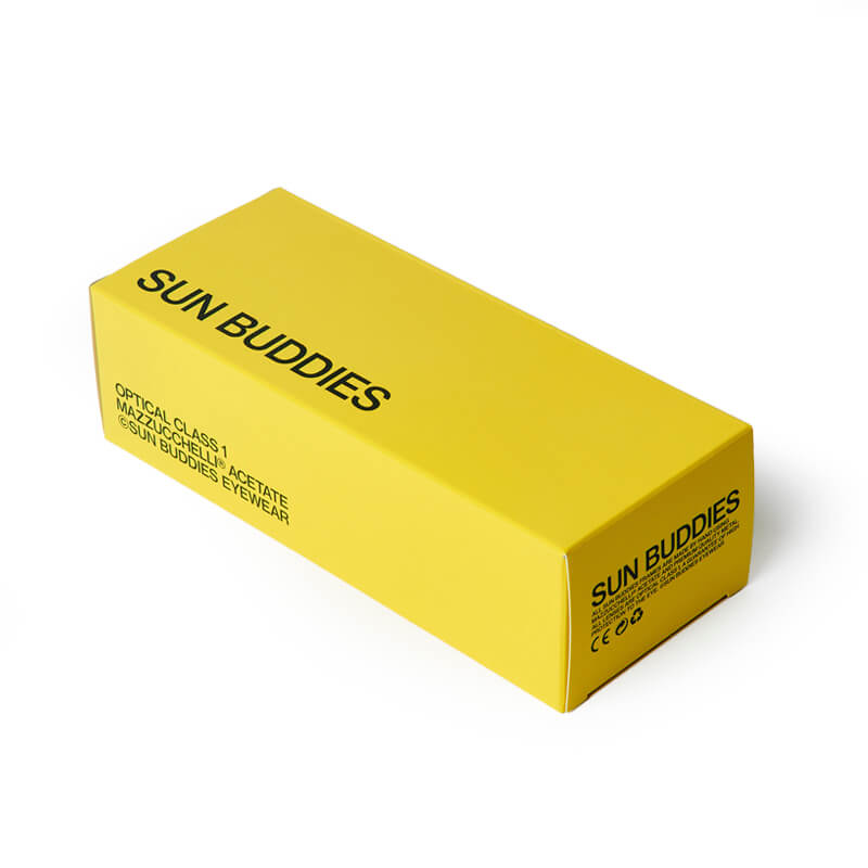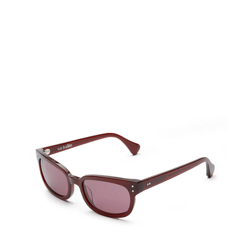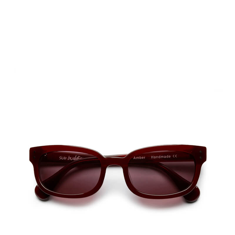 SUN BUDDIES Amber Sunglasses – Bourgogne: Semi transparent 70’s inspired square shaped and slightly thinner frame in a brown tone, handmade of Italian acetate. Green Carl Zeiss lenses with 100% UV protection and a seven bar hinge with two visible rivets on the temple. Comes in a faux leather hard case and a glossy paper box. Cleaning cloth included.