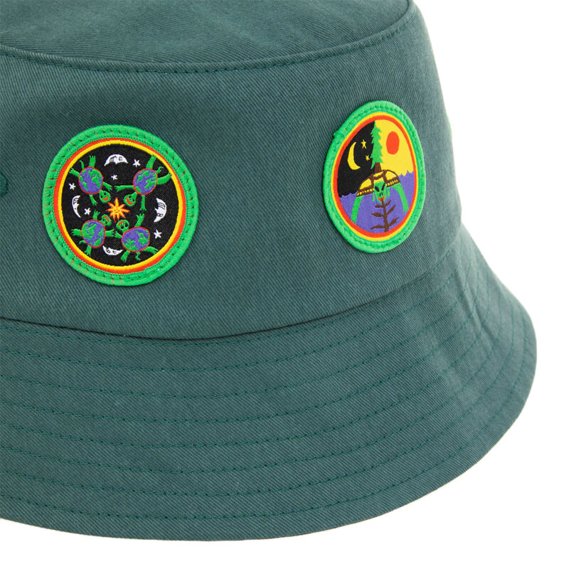 T.I.M.E. Time Patches Bucket Hat – Dark Green: Twill bucket hat with multiple embroidered woven patches. Included in the very first delivery of Turtle Island Meditation Equipment, this T.I.M.E. Time Patches Bucket Hat – Dark Green is equipped with: