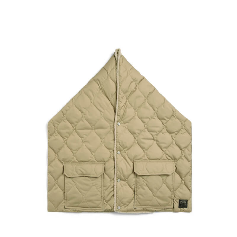 TAION Military Reversible Stole – Coyote / Light Beige: Down-filled fabrics are paramount to TAION’s designs, with pieces like this Scarf is synonymous to the Japanese label. It’s crafted using the usual water repellent, light, soft, fluffy and voluminous feel that is unique to down, then accented with a color scheme of the TAION logo print.