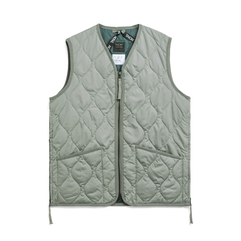 TAION Military V-Neck Vest – Dark Sage Green: Japanese brand Taion’s line-up is brimming with ready-to-wear outerwear – and this green vest is one you can wear season after season. It’s made from a long-lasting fabric, cut to a regular fit and comes padded with down – for added insulation and warmth – whilst military inspired pockets sit at the front to complete the look. The Military Zip V-Neck Vest – Dark Sage Green has been included in Taion’s FW23 collection and features: