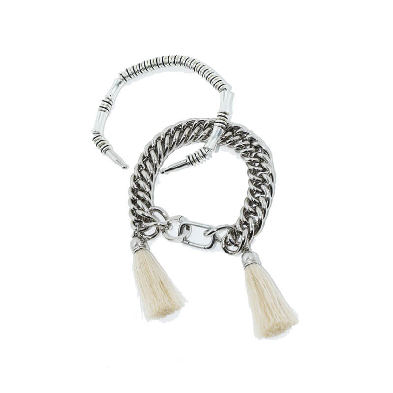 TOGA ARCHIVES Metal Fringe Bangle Set – Silver: Yasuko Furuta’s Toga Pulla continues to elevate accessories and wardrobes alike with its signature avant-garde edge and Americana influence with this bracelet set. This luxurious set of two features an elegantly understated silver-tone bangle, alongside a chunky chain bracelet that’s adorned with delicate fringe detailing – adding effortless high-fashion chic to any look. Included in the last Spring-Summer23 collection, this TOGA ARCHIVES Metal Fringe Bangle Set – Silver features:
