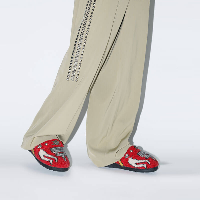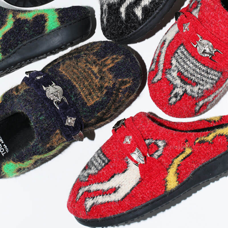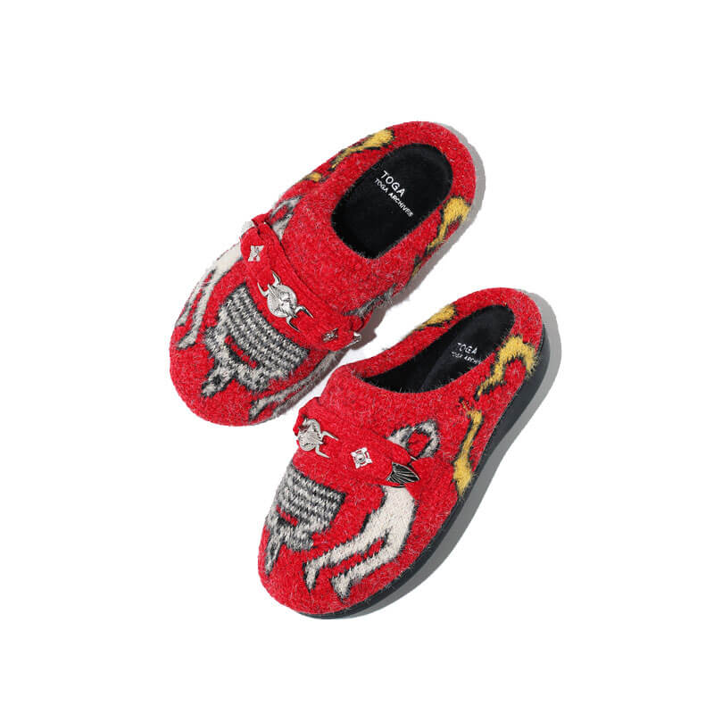TOGA ARCHIVES TOGA x SUBU Knit Slip-On – Red: Slip-on sneaker featuring TOGA’s iconic motifs. The knit upper features original Western motifs and dancing man graphics, and the instep is decorated with sparkling coin metal.