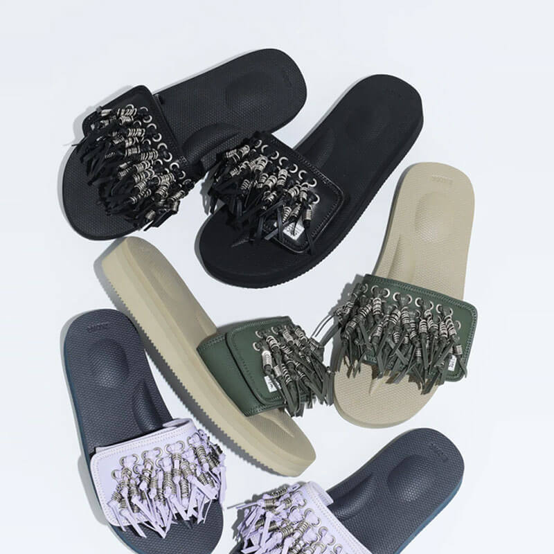 Using one of SUICOKE’s flagships “PADRI” as the base, the slide is embellished with metal rings and leather fringe details that are iconic to TOGA.