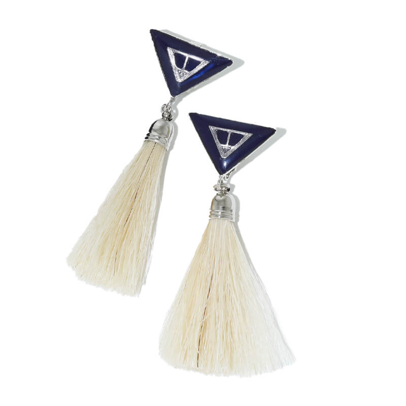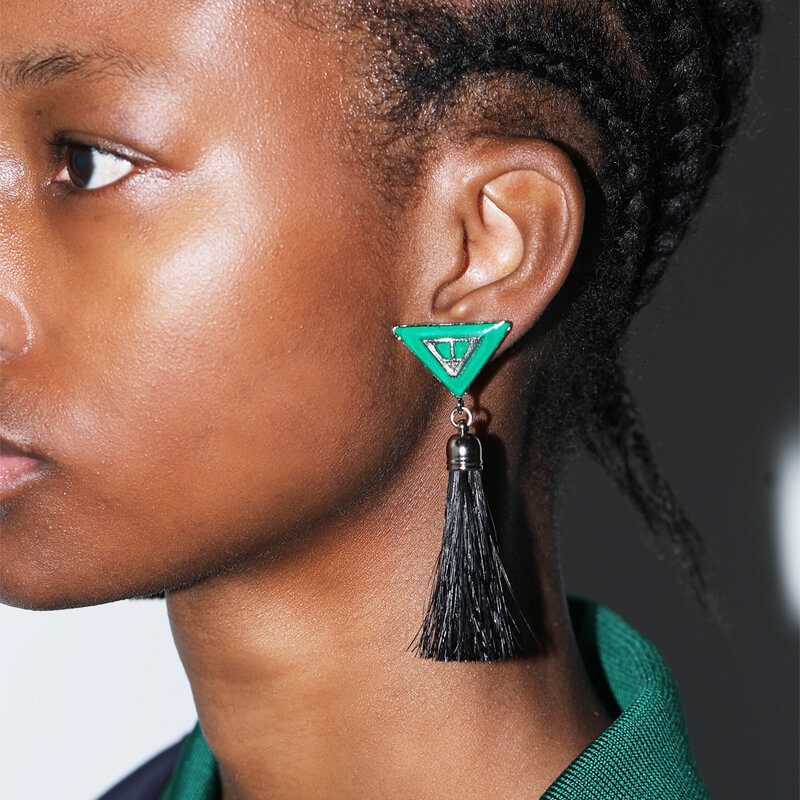 TOGA ARCHIVES Triangle Fringe Earrings – Green: Add a sophisticated touch to any outfit thanks to these clip-on triangle earrings from Toga Pulla. Crafted from alloy, the pair feature green triangles at the studs, then are complete with neutral horsehair fringing for added detail. Included in the last FW23 collection, these TOGA ARCHIVESS Triangle Fringe Earrings – Navy features: