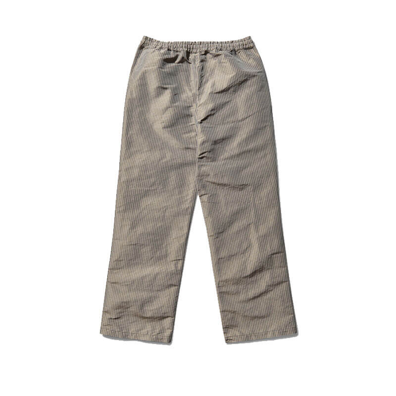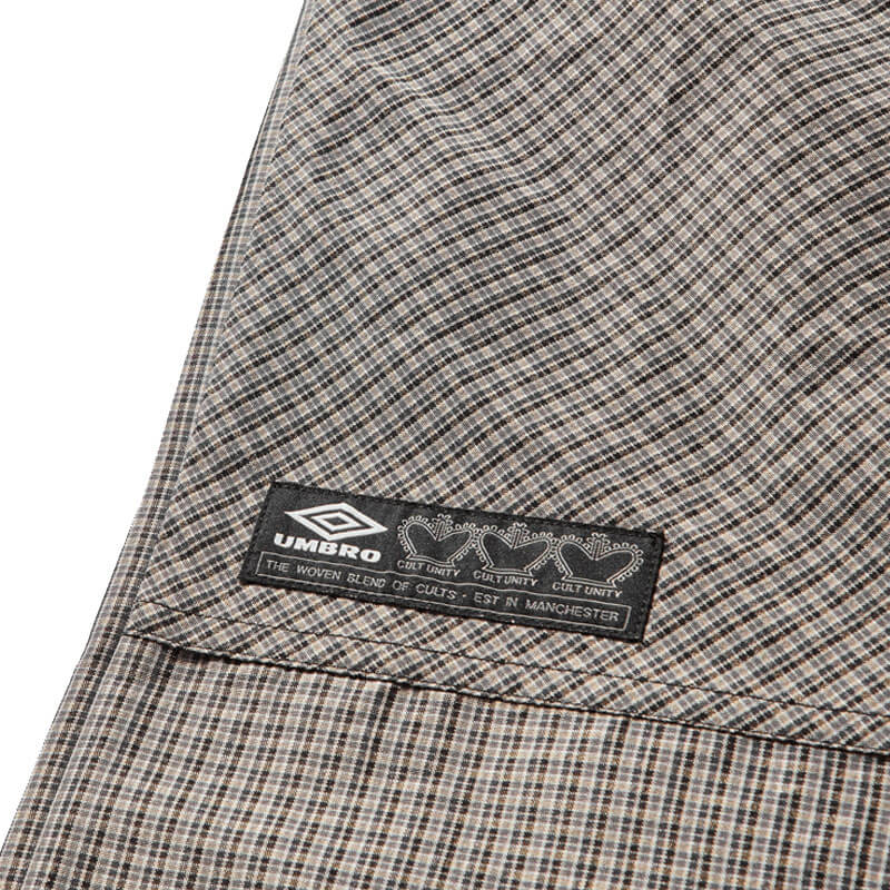 UMBRO Check Track Pants – Beige / Black: Loose fit track pants crafted in checkered pattern polyester fabric, where Italian retailer Slam Jam tying together Umbro’s affiliations in football and subculture, bringing an unconventional edge to Umbro’s casual styles through a contrast of formal tradition and urban grit.