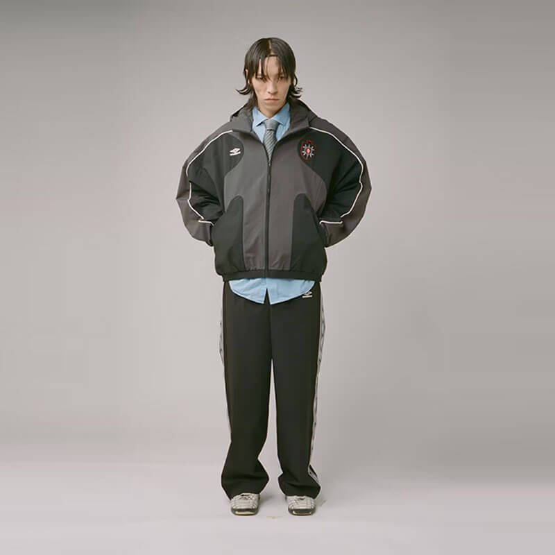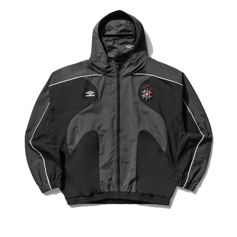 UMBRO Rose Crest Masked Track Jacket – Black / Dark Grey: Boxy fit track jacket with panelling construction, where Italian retailer Slam Jam tying together Umbro’s affiliations in football and subculture, bringing an unconventional edge to Umbro’s casual styles through a contrast of formal tradition and urban grit.