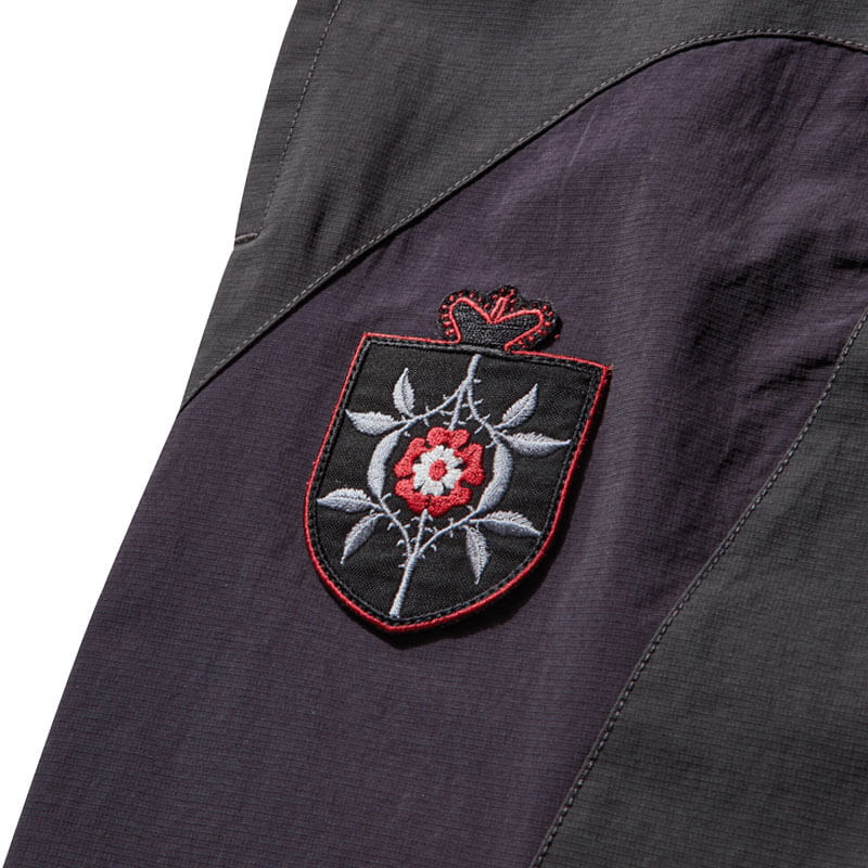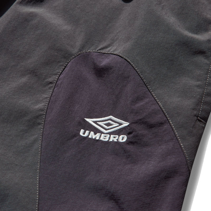 UMBRO Rose Crest Track Pants – Dark Grey / Purple: Loose fit track pants with panelling construction, where Italian retailer Slam Jam tying together Umbro’s affiliations in football and subculture, bringing an unconventional edge to Umbro’s casual styles through a contrast of formal tradition and urban grit.