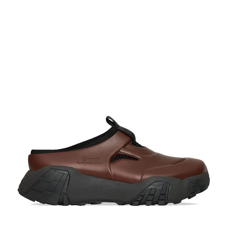SLAM JAM x VIBRAM® Rubber Core Sabot – Chocolate: The iconic powerhouse Slam Jam and Vibram expand their technological and design horizons for the first time. Driven by the desire to find connections between fashion, design and technology, the two entities collide together to create the Rubber Core sabot. The final output is a hybrid shoe made in 5 steps, from the sole to the upper. Compared to the standard shoe-making production, Vibram steamlined the process thermoforming on a 3D last a Vibram StratX rubber sheet to realize a one step upper.