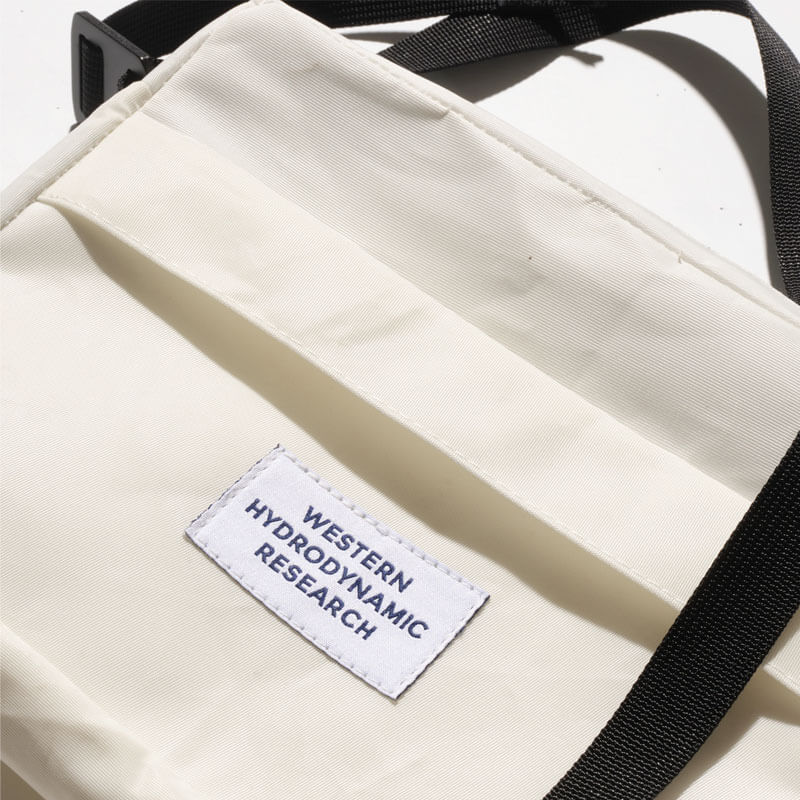 Western Hydrodynamic Research WHR Utility Pouch – White: A conventional staple, the Western Hydrodynamic Research Utility Pouch offers its unique upcycled sail construction, made for everyday use. One-of-one, each bag is different and will look different than the one pictured, including nylon webbing strap with G hook to convert into wearable accessory. Include in the FW23 delivery, this Western Hydrodynamic Research WHR Utility Pouch – White features:
