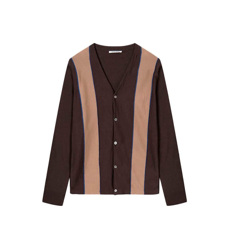 WOOD WOOD Mario Stripe Cardigan – Taupe: Made from 100% lambswool, this regular-fit cardigan has been knitted in a 12-gauge knit to make for a lightweight layer. A vertical stripe panel with a 3D-stripe border appears on each half of the front of the cardigan. Mother of Pearl buttons complete the style. This knitted cardigan, included in Wood Wood FW22 collection, features: