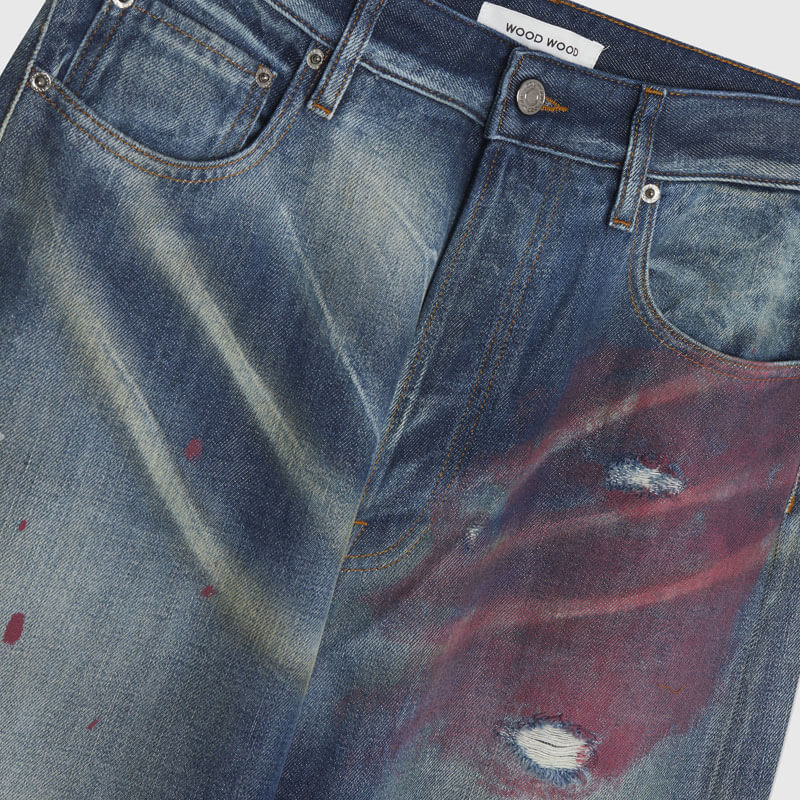WOOD WOOD Paulo Loose Leg – Distressed Paint Wash: Crafted in Italy from 100% cotton, these jeans offer a relaxed and comfortable fit. Featuring both front and back pockets for convenience, they are designed with a distressed paint wash for a unique look, the jeans are finished with belt hems and a button closing. Included in the last FW23 collection, this WOOD WOOD Paulo Loose Leg – Distressed Paint Wash features: