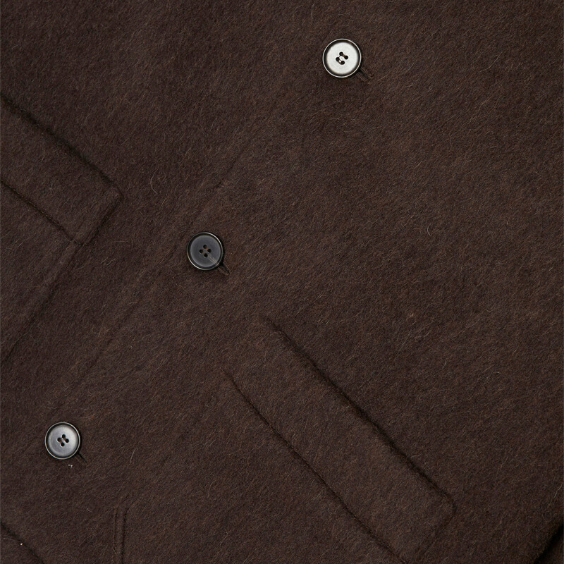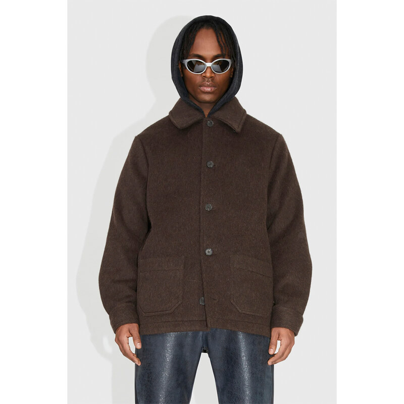 WOOD WOOD Reno Wool Coat – Dark Brown: This wool coat is a versatile addition to your wardrobe. With a regular fit, classic collar, and frontal pockets, this short coat combines fashion and functionality. Made from a blend of wool and included in the last FW23 collection, this WOOD WOOD Reno Wool Coat – Dark Brown features: