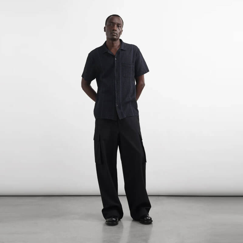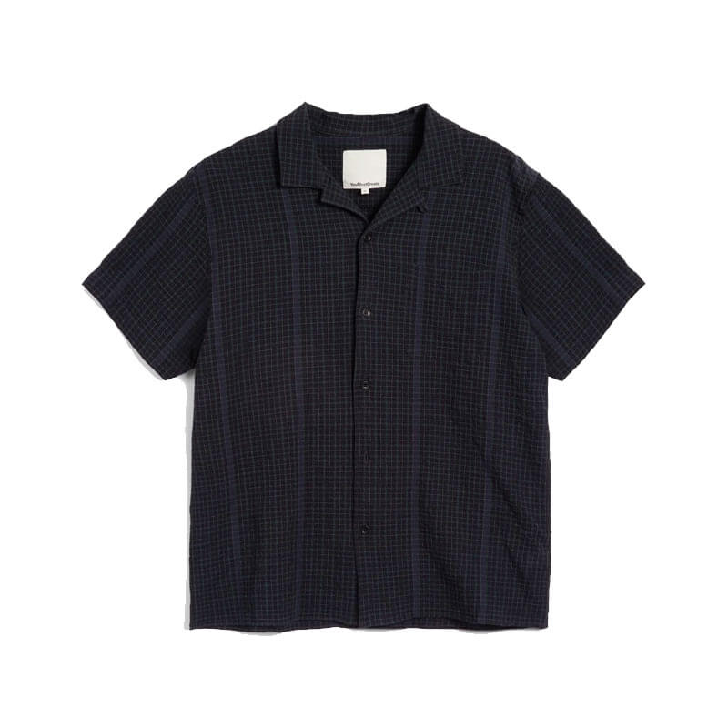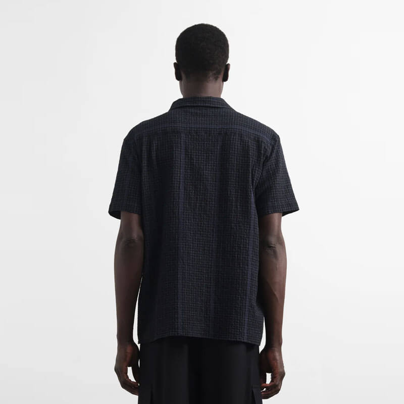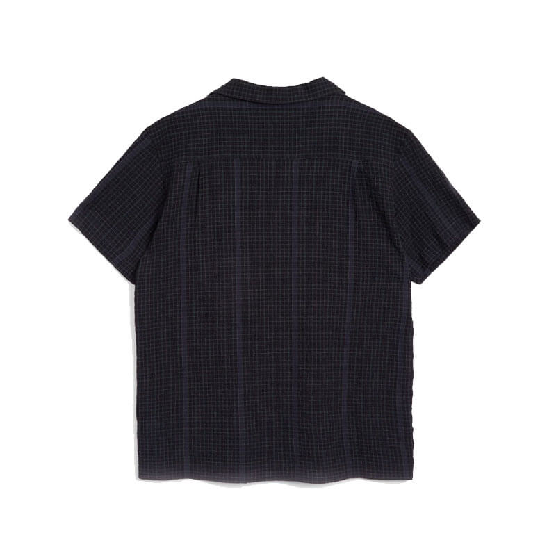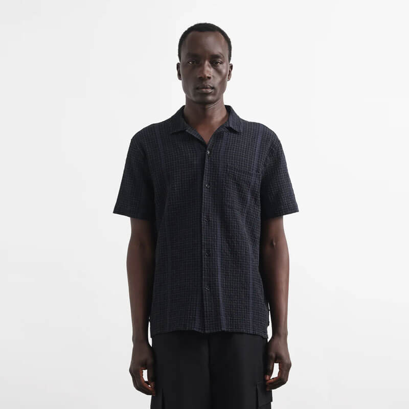 YMC Malick Shirt – Black: Patterned short sleeve shirt crafted in Portuguese cotton blend seersucker.