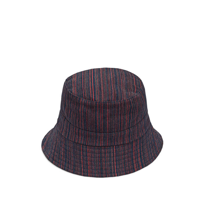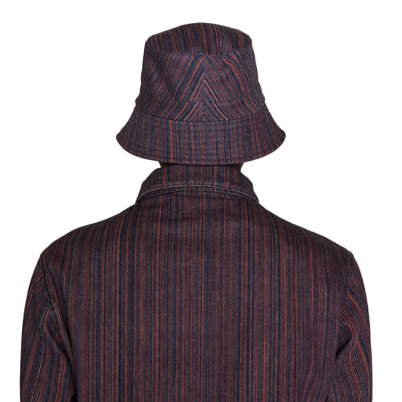 YMC Upcycle Cotton Denim Bucket – Multi: Classic bucket hat in YMC SS22’s signature denim stripe, crafted from upcycled cotton.
